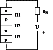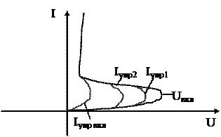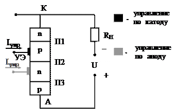 Тиристор имеет 4 – слойную структуру и 3 р - n перехода (П1, П2, П3). Питающее напряжение подается на тиристор таким образом, чтобы переходы П1 и П3 были открыты, а П2 – закрытый. При подаче на тиристор напряжения меньшего, чем напряжение включения, переход П2 остается закрытым и через тиристор протекает малый ток, обусловленный неосновными носителями заряда. Пока приложенное к тиристору напряжение меньше определенного значения ток через тиристор возрастает незначительно. При достижение приложенным напряжением определенного значения (напряжение включения тиристора) происходит лавинный пробой перехода П2, и ток через тиристор резко увеличивается, а падение напряжения на тиристоре падает до уровня U = 0.5…1.5 В. Ток через тиристор при этом определяется сопротивлением нагрузки. При приложении к тиристору напряжения в обратном направлении закрытым оказываются переходы П1 и П3, и ток через тиристор практически равен нулю, если при этом напряжение не превышает максимально допустимого обратного напряжения Uобр.мах. Превышение обратным напряжением максимально допустимого обратного напряжения недопустимо, т.к. происходит пробой. Uобр мах @ 2 U < Uобр мах Рассмотренный тиристор называется диодным тиристором или динистором (неуправляемый тиристор). Снизить напряжение включения тиристора можно путем введения в одну из областей, прилегающих к П2 неосновных носителей заряда. Это осуществляется путем подключения к этой зоне управляющего электрода и пропусканием по цепи «управляющий электрод – анод (катод)» небольшого тока управления (рис. 1.9).