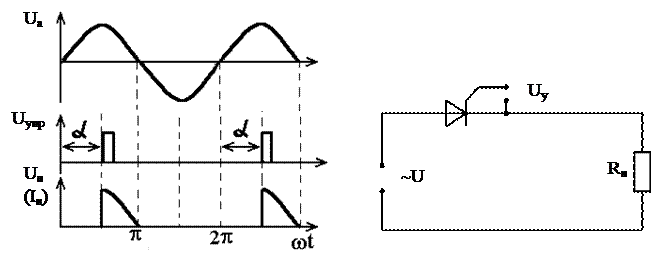 С увеличением тока управления Iу уменьшается напряжение включения тиристора. Если этот ток имеет значение, соответствующее току включения данного тиристора (Iу = Iу.вкл), то тиристор включается (переключается) в открытое состояние при U = 1…2 В. Такой управляемый тиристор – триодный тиристор или просто тиристор. Тиристор может использоваться, как бесконтактный выключатель тока в электрической цепи, т.е. тиристорный контактор. При этом пропусканием малого тока по цепи управляющего электрода обеспечивается включение тиристора и пропускание большого тока по силовой цепи анод- катод. Если к тиристору приложить переменное напряжение, то он будет пропускать ток только в положительные полупериоды. Причем, если изменять момент подачи управляющего тока относительно начала положительного полупериода анодного напряжения, то с помощью тиристора можно будет управлять средним значением тока и напряжения в цепи нагрузки, т.е на базе тиристоров можно создать управляемые выпрямители (рис. 1.10).