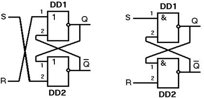 а б Рисунок 4.7 – Реализация RS-триггера с прямыми входами на элементах ИЛИ-НЕ (а) и RS-триггера с инверсными входами на элементах И-НЕ (б)