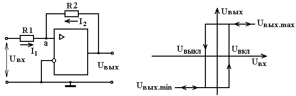 При достаточно большом положительном входном напряжении выходное напряжение компаратора равно UВЫХ.MAX. При уменьшении UВХ выходное напряжение не изменится, пока потенциал точки а не станет равным нулю. Тогда выходное напряжение скачком изменится до UВЫХ.MIN. Так как I1=UВХ/R1= -I2 = - UВЫХ/R2 То при переключении (выключении)