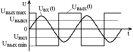 Триггеры Шмитта широко используют в качестве порогового устройства для регистрации превышения входным напряжением определенного порогового значения (UВКЛ или UВЫКЛ). Например в схемах переключения направления подачи электродной проволоки с обратного на прямое после возбуждения дуги и достижении напряжением на дуге заданного уровня, в схемах фазового управления тиристорами в сварочных выпрямителях и т.п. Применяют триггеры Шмитта также в схемах формирования напряжения прямоугольной формы из входного напряжения произвольной формы, как показано на рис.4.24.