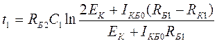 Предположим, что в начальный момент t = 0 (рис.4.25, б) транзистор VT1 открылся, а VT2 закрылся. Конденсатор С1 при этом заряжен с полярностью указанной на рисунке, а С2 разряжен. Открытие Транзистора VT1 связано с окончанием разряда конденсатора С2 и появлением на базе VT1 положительного напряжения, подаваемого через резистор RБ1. При открытии VT1 напряжение конденсатора С1 через транзистор VT1 прикладывается к цепи база – эмиттер транзистора VT2, с полярностью, обеспечивающей его запирание. С момента t = 0 конденсатор С2 начинает заряжаться через резистор RК2 и цепь база – эмиттер транзистора VT1, а конденсатор С1 – разряжаться через открытый транзистор VT1 и резистор RБ2 с постоянной времени RБ2С1. По мере разряда конденсатора С1 напряжение на базе VT2 становится все менее отрицательным и, наконец через промежуток времени t1 транзистор VT2 откроется положительным напряжением, подаваемым на его базу через RБ2. Транзистор VT1 при этом закроется напряжением заряженного конденсатора С2, которое будет приложено минусом к базе VT1 через открытый транзистор VT2. Конденсатор С2 к моменту разряда конденсатора С1 будет разряжен, так как RК всегда значительно меньше RК и постоянная времени заряда С2 (RК2С2) меньше времени разряда С2 - (RБ2С1). С момента t1 конденсатор С1 начнет заряжаться через резистор RК1, а конденсатор С2 – разряжается через RБ1 и открытый транзистор VT2 с постоянной времени RБ1С2. После разряда С2 произойдет обратное переключение, то есть VT1 откроется, а VT2 закроется, и далее процессы будут повторятся. При этом: