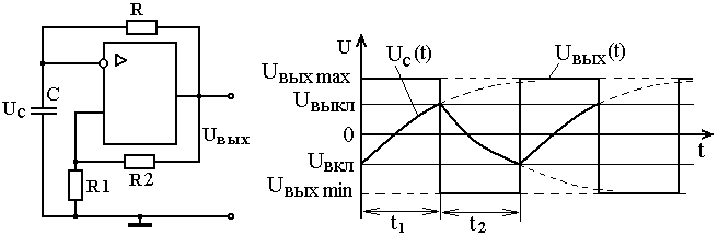 напряжение UВЫХ скачком изменится до UВЫХ.MIN. Так как UВЫХ.MIN = - UВЫХ.MAX, то конденсатор начнет перезаряжаться от UВЫКЛ до -UВЫХ MAX и обратное переключение произойдет при