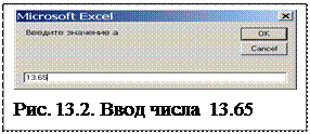 Введенные числовые данные возвращаются функцией как строчные, поэтому при вводе числа необходимо использовать функцию Val, преобразующую строку в число. Например, требуется ввести значение переменной а= 13.65.