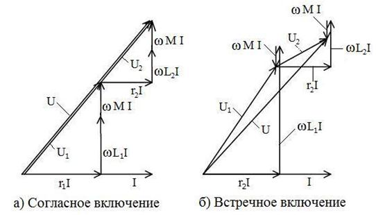 В приведенных выражениях верхний знак относится к согласному включению катушек, а нижний – к встречному. Векторные диаграммы напряжений и токов при согласном и встречном включении индуктивно связанных катушек, соединенных параллельно, приведены на рис.2,а и б соответственно