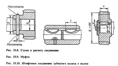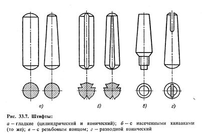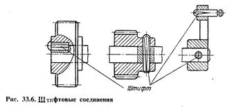 Штифтовые соединения (рис. 33.6) применяют при небольших нагрузках преимущественно в приборостроении. Детали соединяются при этом по переходным посадкам.