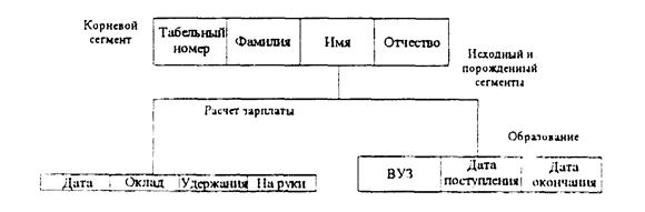 Подобные сегменты Рис.2.1 Два связанных сегмента, расположенные на смежных уровнях (рис. 2.1), называются исходными (для более высокого уровня) и порожденными (для более низкого). Иерархическая запись есть система иерархически взаимосвязанных сегментов, в которой каждый порожденный сегмент представлен столько раз, сколько необходимо для полного раскрытия исходного сегмента. В каждой логической структуре БД имеется единственный сегмент, который не зависит ни от какого другого сегмента. Этот сегмент называется головным или корневым. В корневом сегменте обычно располагается идентификатор объекта, свойства которого раскрываются в сегментах второго и более глубоких уровней иерархии. Все сегменты одного типа, которые порождены одним и тем же исходным сегментом, называются подобными. Для более полного понимания сути иерархической модели данных рассмотрим следующий пример. Предположим, что у нас появилась необходимость создать базу данных, содержащую информацию о темах научно-исследовательских работ и их исполнителях. Тогда её иерархическая модель будет иметь вид, показанный на рис. 2.2. Наряду с явными достоинствами иерархическая модель имеет недостатки: затруднения при выполнении операций включения, и удаления, а также сложность реализации отображения М:М. Исполнитель Концепция сетевой модели данных связана с именем известного специалиста в области систем обработки данных Ч. Бахмана. Будучи одним из идеологов СУБД сетевого типа, он оказал существенное влияние на разработку проекта Рабочей группы по базам данных КОДАСИЛ (CODA-SYL) – Ассоциации по языкам и системам обработки данных [6]. Эта ассоциация внесла большой вклад в разработку теории сетевых моделей данных, языков описания и манипулирования СУБД. Сетевые СУБД используют модель представления данных в виде произвольного графа. Основной конструкцией сетевой модели данных является набор. Набор представляет собой поименованную совокупность записей, образующих двухуровневую иерархическую структуру, причем один тип записи определяется как "владелец", а другие являются "членами" набора. Каждый экземпляр набора состоит из одного экземпляра записи-владельца и одного или более экземпляров записей-членов.