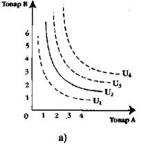 Обратимся к проблеме оптимизации потребления. Как определить предпочтение одних комбинаций товаров покупателей (потребителей) другим комбинациям, или наборам товаров. Инструментом такого анализа явились так называемые кривые безразличия, которые широко используются при исследовании многих микроэкономических процессов, связанных с проблемой выбора: выбор оптимального набора потребительских благ, выбор оптимального сочетания факторов производства, выбор оптимальной комбинации между досугом и рабочим временем и т. д. Возьмем потребителя, располагающего фиксированным денежным доходом, который он целиком тратит на потребление. Для простоты предположим, что он покупает только два вида товаров: А и В. Очевидно, что имеются некоторые комбинации количества этих товаров, которые дают равную общую полезность для потребителя (например, два товара А и три товара В имеют такую же общую полезность, как три товара А и два товара B и т. д.). Отказ от одного из товаров компенсируется получением другого товара в большем количестве. К этим комбинациям товаров А и В потребитель, следовательно, в равной мере безразличен. Безразличен не означает равнодушен. Любые отмеченные комбинации товаров одинаково хороши для потребителя, т. к. приносят одинаковую полезность. Если эти комбинации покажем графически, то получим плавную кривую безразличия U2 (рис. 5.12а). Эта кривая проведена таким образом, что если бы потребитель мог выбрать любые точки на ней, они были бы для него одинаково желательны, и ему было бы совершенно все равно, какую комбинацию он получит. Кривая U2 - это лишь одна из бесчисленного множества возможных кривых.