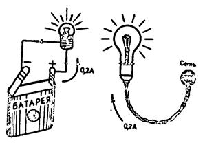 Электрический ток, протекая через данный потребитель, производит какую-то работу, например, нагревает нить электрической лампочки, притягивает якорь электромагнита, приводит вдействие ротор электродвигателя и т. д. Производимая работа зависит не только от протекающего количества электричества, но и от приложенного напряжения. В этом мы можем убедиться, рассмотрев рис. 3.6, на котором показаны лампочка для карманного фонарика и обыкновенная лампа накаливания в40 ватт.