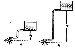Через обе лампы протекает ток примерно в 0,2 ампера, т. е. за единицу времени протекает одно и то же количество электричества. Однако вторая лампа светит намного ярче, потому что приложенное напряжение больше. Здесь может возникнуть вопрос: поскольку количество электричества одно и то же, то почему во втором случае электроны являются носителями большей энергии и отличаются ли чем-нибудь входящие в лампу электроны от выходящих из нее? За объяснением обратимся к рис. 3.7, на котором показаны два случая вытекания одного и того же количества воды, падающей с различной высоты. И здесь можно задать вопрос: почему во втором случае энергия водных частиц больше? Энергия частиц воды обусловлена земным гравитационным полем. Когда частицы падают в направлении поля, они выделяют энергию, которую можно использовать. Таким же образом энергия электронов связана с электрическим полем, созданным источником тока. Это поле действует на каждый электрон так, что электроны при движении выделяют энергию. Но в то же время как частицы воды падают всегда к центру земли, электроны «падают» от одного полюса источника тока к другому.
