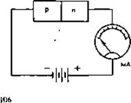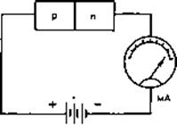 Полупроводниковые диоды Для производства диодов, транзисторов и пр. используют полупроводники:, германий, кремний, арсенид галлия и селен. Они имеют кристаллическую структуру и в чистом виде обладают свойствами, подобными свойствам изоляторов. Для получения. диодов и транзисторов к чистым полупроводникам добавляют оnределенные nримеси. В зависимости от вида примессй могyт получиться две разновидности: р-полупроводник и n-полупроводник, которые проводят электрический ток намного лучше чистых nолуnроводников. Электрическая проводнмость любого n-полупроводника основана на свободных электронах, т. е. она подобна проводнмости металлов. Электрическая проводнмость лю- бого р-полупроводника обусловлена т.н. дырками. Их можно рассматривать как фиктивные положительные частицы, поскольку они представляют собой места в кристаллической решетке, где отсутствуют валентные электроны. Важнейшее свойство р- и n-полупроводников – oдносторонняя проводимость в месте спайки (рис. 17.1). Эта спайка называется р-n-пepeходом и производится по специальной технологии. Ширина р- n-перехода очень мала, от 1 до 50 мкм (напоминаем, что 1 мкм равен 1/1000 миллиметра). Коrда «плюс» источника тока соединен с р-областью (рис. 17.lа), говорят, что переход включен в nрямом направлении. В этом случае eгo сопротивление мало, и ток в цепи может быть значительным. Когда "минус" источника тока соединен с р-областью (рис. 17.1 б), переход включен в оборатном направлении. В этом случае eгo сопротивление очень велико, и ток в цепи почти не протекает. Односторонняя проводимость перехода яляется основой дейстия nолуnроводниковых диодов, транзисторов, тиристоров и пр.