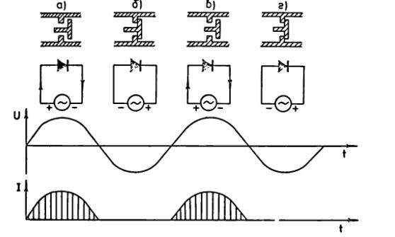 Рис. 17.1а Рис.17.1б Главным свойством диода является его односторонняя проводимость – он пропускает ток только в одном направлении. По своему действию диоды похожи на вентили. Односторонняя проводимость диодов называется еще вентильным свойством. Действительно, из рис. 17.2 видно, что если к диоду приложено переменное напряжение, диод открыт только во время положительного полупериода напряжения, так что ток через диод состоит из отдельных импульсов.