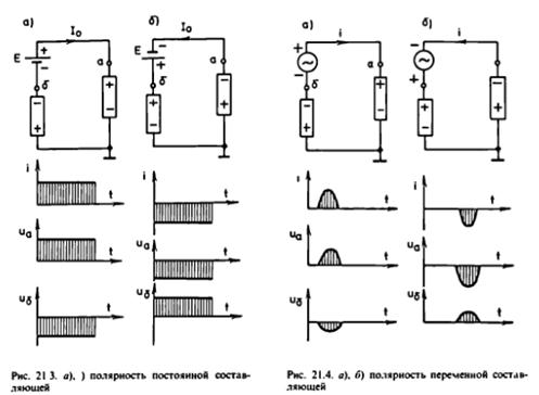 На рис. 21.3а и б показаны цепи, содержащие только постоянную составляющую. Здесь и в последующих схемах за положительную полярность выбрано направление по часовой стрелке. Под ними на основании упомянутого правила даны графики токов и полярность напряжений в точках а и б. На рис. 21.4 показана цепь, содержащая только переменную составляющую. Под схемами начерчены графики токов и дана полярность напряжений в точках а и б в один и другой полупериод. На рис. 21.5 показана цепь, содержащая одновременно и постоянную и переменную составляющие, причем постоянная составляющая положительна. И здесь начерчены графики токов и обозначена полярность напряжений в точках а и б. Обратите внимание на то, что в один полупериод постоянная и переменная составляющие имеют одно направление, благодаря чему абсолютное значение токов и напряжений возрастает. В другой полупериод постоянная и переменная составляющие имеют противоположное направление, благодаря чему абсолютная величина токов и напряжений уменьшается. На рис. 21.6 показана та же цепь, однако ее постоянная составляющая отрицательна.