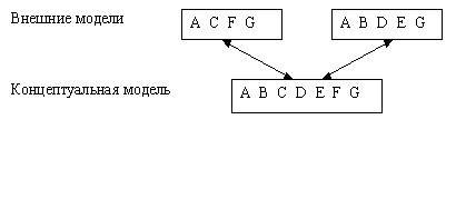Рис.15.23. Пример соотношения между концептуальной моделью и внешними моделями Появление новых или изменение информационных потребностей существующих приложений требуют определения для них корректных внешних моделей, при этом на уровне концептуальной и внутренней модели данных изменений не происходит. Изменения в концептуальной модели, вызванные появлением новых видов данных или изменением их структур, могут затрагивать не все приложения, т.е. обеспечивается определенная независимость программ от данных. Изменения в концептуальной модели должны отражаться на внутренней модели, и при неизменной концептуальной модели возможна самостоятельная модификация внутренней модели БД с целью улучшения ее характеристик (время доступа к данным, расхода памяти внешних устройств и др.). Таким образом БД реализует принцип относительной независимости логической и физической организации данных.