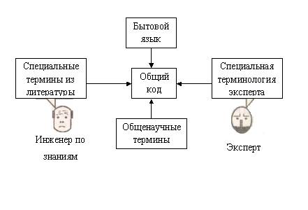 Большинство психологов и лингвистов считают, что язык - это основное средство мышления наряду с другими знаковыми системами "внутреннего пользования". Языки, на которых говорят и размышляют аналитик и эксперт, могут существенно отличаться. Итак, нас интересуют два языка - язык аналитика, состоящий из трех компонентов: ∙ терминов предметной области, которые он почерпнул из специальной литературы в период подготовки; ∙ общенаучной терминологии из его "теоретического багажа"; ∙ бытового разговорного языка, которым пользуется аналитик; и язык эксперта, состоящий: ∙ из специальной терминологии, принятой в предметной области; ∙ общенаучной терминологии; бытового языка; ∙ неологизмов, созданных экспертом за время работы(его профессиональный жаргон). Если считать, что бытовой и общенаучный языки у двух участников общения примерно совпадают, то некоторый общий язык, или код, который необходимо выработать партнерам для успешного взаимодействия, будет складываться из потоков, поправленных на (рис.17.6). В дальнейшем этот общий код преобразуется в некоторую понятийную (семантическую) сеть, которая является прообразом поля знаний предметной области.