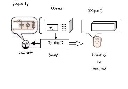 Рис. 17.6. Схема получения общего кода. Выработка общего кода начинается с выписывания аналитиком всех терминов, употребляемых экспертом, и уточнения их смысла. Фактически это составление словаря предметной области. Затем следуют группировка терминов и выбор синонимов (слов, означающих одно и то же). Разработка общего кода заканчивается составлением словаря терминов предметной области с предварительной группировкой их по смыслу, т.е. по понятийной близости (это уже первый шаг структурирования знаний). Рис.17.7 дает представление о неоднозначности интерпретации терминов двумя специалистами. В семиотике, науке о знаковых системах, проблема интерпретации является одной из центральных. Интерпретация связывает "знак" и "означаемый предмет". Только в интерпретации знак получает смысл. Так, на (рис.17.7) слова "прибор X" для эксперта означают некоторую конкретную схему, которая соответствует схеме оригинала прибора, а в голове начинающего аналитика слова "прибор X" вызывают пустой образ или некоторый "черный ящик" с ручками.