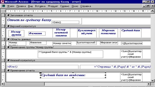 Рис. 21 Вид отчета в режиме конструктора Отчет может содержать следующие основные разделы: заголовок отчета – печатается в начале отчета на титульной странице, содержит название отчета; верхний колонтитул – печатается вверху каждой страницы; как правило, содержит заголовки столбцов; заголовок группы – печатается перед обработкой первой записи группы, в качестве заголовка может содержать поле, по которому выполняется группировка; область данных – печатается каждая запись из источника данных; примечание группы – печатается после обработки последней записи группы; может содержать итоговые данные по записям, входящим в группу; нижний колонтитул – печатается внизу каждой страницы, может содержать, например, дату печати отчета, номер страницы отчета; примечание отчета – печатается в конце отчета после обработки всех записей, может содержать итоговые данные по всем записям. Создание простых отчетов. Для создания простого одноколонного отчета необходимо: 1. Находясь на вкладке «Отчеты» нажать кнопку «Создать». 2. В окне «Новый отчет»: - выбрать инструмент «Автоотчет в столбец»; - выбрать источник данных в виде таблицы или запроса; - нажать «ОК». Для создания многоколонного отчета следует: 1. Создать простой одноколонный отчет. 2. Выполнить команду Файл/Параметры страницы. В диалоговом окне «Параметры страницы» выбрать вкладку «Столбцы» и задать: - в группе «Параметры сетки» число столбцов, которые должны выводиться на каждой странице (поле «Число столбцов»), ширину межстрочного интервала (поле «Интервал»), расстояние между столбцами (поле «Столбцов»); - в группе «Размер столбца» ширину столбца (поле «Ширина») и высоту строки (поле «Высота»); - в группе «Макет столбца» параметры, определяющие порядок печати записей: «Сверху вниз» или «Слева направо». 3. На вкладке «Страница» выбрать ориентацию страницы. При печати многоколонного отчета заголовок и примечание отчета, верхний и нижний колонтитулы выводятся на полную ширину отчета, поэтому размещать в режиме конструктора элементы управления в этих разделах можно в произвольных местах. Заголовки и примечания групп, а также область данных группы выводятся на ширину одного столбца. Создание отчетов с группировкой и подведением итогов мастером отчетов. Для создания отчета следует: 1. Находясь на вкладке «Отчеты» нажать кнопку «Создать». 2. В окне «Новый отчет»: - выбрать инструмент «Мастер отчетов»; - выбрать источник данных в виде таблицы или запроса; - нажать ОК. и затем следовать по шагам мастера отчета. Создание отчетов с группировкой и подведением итогов в режиме конструктора. Для создания отчета необходимо: 1. Создать новый отчет, выбрав в окне БД объект «Отчеты» - режим «Конструктор». Выбрать источник данных (таблица / запрос), нажать «ОК». В окне конструктора появится пустой макет отчета. В разделе «Заголовок» разместить, элемент управления «Надпись». Текст надписи станет заголовком создаваемого отчета. Если раздел заголовка отсутствует в макете отчета, следует выбрать команду Вид/Заголовок/ Примечание отчета. В разделе «Верхний колонтитул» разместить элемент управления «Подписи» к тем полям, которые будут находиться в области данных. Если верхний колонтитул отсутствует в макете, следует его добавить командой Вид/Колонтитулы. Верхние и нижние колонтитулы можно размещать в т