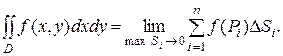 Рассмотрим в плоскости Оху замкнутую область D, ограниченную линией L. Разобьем эту область какими-нибудь линиями на n частей ∆S1, ∆S2,…, ∆Sn (причем теми же символами ∆S1, ∆S2,…, ∆Sn будем обозначать и площади соответствующих частей) и выберем в каждой части точку Рi. Пусть в области D задана функция z=f(x,y). Обозначим через f(P1), f(P2),…, f(Pn) значения этой функции в выбранных точках и составим сумму произведений вида f(Pi)ΔSi: Опр. 1. Сумма вида Замечание. 1. С геометрической точки зрения (при Опр. 2. Если существует один и тот же предел интегральных сумм (1) при n→∞ и max∆Si →∞, не зависящий от способа разбиения области D и выбора точек Pi, то он называется двойным интегралом от функции f(x,y) по области D и обозначается Замечание 2. Для выяснения вопроса об условиях интегрируемости функции двух переменных можно по аналогии со случаем определенного интеграла ввести понятие верхней и нижней интегральных сумм, выбирая в каждой части области D точки, значение функции в которых является наибольшим и наименьшим для данной части. Тогда можно доказать, что необходимым и достаточным условием интегрируемости функции f(x,y) является, во-первых, ее ограниченность на D, а во-вторых, условие Замечание 3. Если функция f(x,y) непрерывна на D, то она интегрируема по этой области. Свойства двойных интегралов: Часть свойств двойных интегралов непосредственно вытекает из определения этого понятия и свойств интегральных сумм, а именно: 1. Если функция f(x,y) интегрируема в D, то kf(x,y) тоже интегрируема в этой области, причем