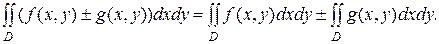 2. Если в области D интегрируемы функции f(x,y) и g(x,y), то в этой области интегрируемы и функции f(x,y)±g(x,y), и при этом