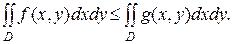 3. Если для интегрируемых в области D функций f(x,y) и g(x,y) выполняется неравенство f(x,y)≤g(x,y), то 4. Если область D разбита на две области D1 и D2 без общих внутренних точек и функция f(x,y) непрерывна в области D, то