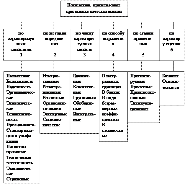 единичные, характеризующие одно свойство (например, показатель тяговой мощности характеризует группу тягово-скоростных свойств); групповые, относящиеся к определенной группе свойств (например, к эргономическим); обобщенны е, т.е. групповые показатели с коэффициентами весомости, выбранные для оценки конкретной машины, интегральные, являющиеся отношением суммарного полезного эффекта от эксплуатации машины к суммарным затратам на ее создание и эксплуатацию.