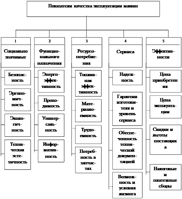 Объединенные в первой системе социально значимые свойства машины оказывают влияние на жизнь, здоровье, эстетические потребности граждан, сохранность их имущества и окружающей среды. Вторая система, характеризующая функциональное назначение машины, объединяет свойства, определяющие основные функции, которые обусловливают область ее применения. Третья характеризует экономичность эксплуатации машины. Четвертая, определяющая новые показатели сервиса, характеризует степень ответственности изготовителя перед потребителем машин. Пятая включает в себя показатели эффективности машин, на которых базируется интегральный показатель качества.