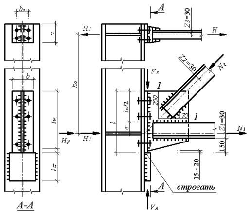 Рис. 5.9. К расчету болтов крепления фланца опорного узла к колонне Условно предполагается, что возникающее при этом вращение узла проходит вокруг линии, проходящей через ось болтов, наиболее удаленных от точки приложения силы Н (примерно на 40 – 80 мм ниже верха фасонки). Усилие, приходящееся на наиболее нагруженный болт определяется по формуле N max = N 1 = где z – расстояние от нижнего пояса фермы (линия приложения силы Н) до оси наиболее удаленного болта; l 1 – расстояние между крайними болтами;