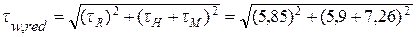 Рис. 5.10. К расчету сварного шва крепления фланца к фасонке При действии опорного давления FR швы срезаются вдоль, в них возникают напряжения: τR = FR /(2 βzkf lw) = 479,3 / (2 ∙ 1,05 ∙ 1 ∙ 39) = 5,85 кН/см2. где kf = 10 мм (задаются в пределах 10 – 20 мм); lw = hф – 10 = 400 – 10 = 390 мм. Усилие Н приводит к срезу шва в направлении, перпендикулярном оси шва: τН = Н /(2 βzkf lw) = 483 / (2 ∙ 1,05 ∙ 1 ∙ 39) = 5,9 кН/см2. Поскольку центр шва не совпадает с осью нижнего пояса, на шов действует момент М = Не = 483 ∙ 8 = 3864 кН∙см. Под действием момента шов также работает на срез перпендикулярно оси шва: τМ = М / Wz = 6 M /(2 βzkf lw 2) = 6 ∙ 3864 / (2 ∙ 1,05 ∙ 1 ∙ 392) = 7,26 кН/см2. Шов проверяем в наиболее напряженной точке А по металлу границы сплавления по результирующей напряжений: