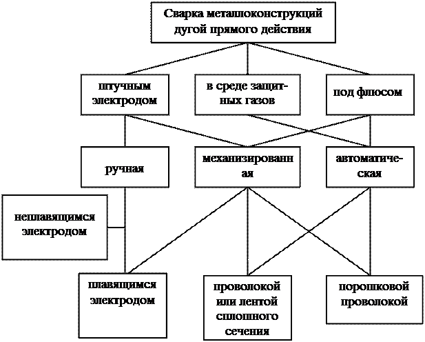 Классификация способов сварки металлоконструкций приведена на рис. 10.2. В зависимости от среды, в которой происходит дуговой разряд, различают три разновидности электросварки: открытой дугой; закрытой дугой, горящей под слоем флюса; дугой, горящей в среде защитного газа. В зависимости от условий изготовления и монтажа, конструктивных особенностей узлов и элементов металлоконструкций, основных конструкционных материалов применяются следующие способы электродуговой сварки: ручная, механизированная и автоматическая. Ручная сварка осуществляется штучными электродами, имеющими специальное покрытие, которое выполняет стабилизирующие, защитные и легирующие функции. Ручная сварка позволяет осуществлять качественное соединение во всех пространственных положениях и в любых погодных условиях. При этом способе длина дуги, подача электрода со скоростью его расплавления и перемещение дуги вдоль свариваемых кромок осуществляется вручную. Автоматическая и механизированная сварки под флюсом – это способы дуговой сварки, при которых дуга горит между электродом и свариваемым изделием под слоем флюса. Флюс, расплавляясь, обеспечивает надежную защиту расплавленного металла и повышает стабильность горения дуги. Сварка осуществляется автоматом или полуавтоматом с подачей сварочной проволоки без покрытия.