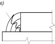 Рис. 10.13. Сварочные напряжения в угловом шве: а – эпюры сварочных напряжений; б – однослойная сварка; в – многослойная сварка Остаточные сварочные деформации, как правило, ухудшают работу конструкций, приводя к отклонениям от проектных размеров. Искажение размеров элементов сварных конструкций затрудняет в некоторых случаях последующую сборку, приводя к дополнительным дорогостоящим операциям по исправлению конструкций. Однако иногда остаточные сварочные деформации могут иметь положительное влияние на работу конструкций. Например, серповидность двутавровой балки можно использовать как начальный строительный подъем. Укорочение элементов конструкций от сварки требует изготовление деталей и узлов сварных конструкций несколько больших размеров. Величина, на которую увеличиваются размеры конструкции, называется припуском и определяется либо расчетом, либо опытным путем. Влияние сварочных напряжений на прочность соединения. Многолетний опыт сооружения и эксплуатации стальных сварных конструкций показал, что прочность их при статической и динамической нагрузках в большинстве случаях не зависит от наличия остаточных напряжений. При остаточных напряжениях линейного характера, совпадающих по знаку с напряжениями от нагрузки, может измениться величина усилий, вызывающих местный переход напряжений за пределы текучести и появление пластических деформаций. По достижении в наиболее напряженных точках конструкции предела текучести дальнейший рост напряжений прекратится, так как произойдет перераспределение напряжений на прилежащие зоны металла. Этим обеспечивается высокая прочность сварных соединений. При плоском однозначном поле сварочных напряжений (например, средняя зона двух листов, сваренных встык, испытывающих растяжение в двух направлениях) они препятствуют развитию пластичности при суммировании сварочных и силовых напряжений и могут вызвать хрупкое разрушение изделия. Их неблагоприятное воздействие усиливается источниками концентрации напряжений вследствие дефектов сварного шва. Особенно опасны сварочные напряжения, появляющиеся при сварке толстых изделий, так как в этом случае распределение остаточных напряжений носит объемный характер, еще более затрудняющий влияние пластичности материла на выравнивание напряжения. Остаточные сварочные деформации, влияя на геометрическую форму конструкций и их элементов, иногда снижают их несущую способность. Такие деформации, как искривление продольной оси элементов, работающих на сжатие, грибовидность полок балок и колонн, коробление стенок балки и колонны (под действием сжимающих сварочных напряжений возникают в стенке так называемые хлопуны) могут значительно снизить значение критических нагрузок, вызывающих потерю устойчивости конструкции. Размер остаточных деформаций зависит от технологии сборочно-сварочных работ и конструктивной формы. Последняя может иметь решающее значение, поэтому в процессе конструирования должны быть заранее известны характер ожидаемых деформаций и их ориентировочные размеры.