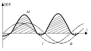 Если ток якоря Iа и магнитный поток Фв совпадают во времени по фазе, то вращающий момент М, несмотря на переменный характер Iа и Фв не изменяет своего направления, так как одновременно с током аналогично меняется и поток. Однако вследствие изменения тока и потока во времени М не остается постоянным по величине. При наличии временного сдвига между током Iа и потоков Фв в определённые моменты времени вращающий момент М меняет знак. В этом можно убедиться, анализируя выражение вращающегося момента Пусть b - угол сдвига потока относительно тока во времени. Тогда момент