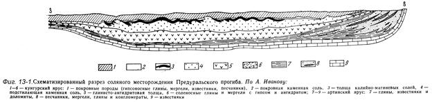 Вопрос 25. Металлогения платформенного чехла: месторождения каменных солей и фосфоритов. Месторождения каменных солей (эвапоритов) формировались в различные эпохи развития земли на континентах, формируются они и в наши дни. По геодинамической позиции различаются месторождения континентальных окраин, внутренних бассейнов, предгорных и межгорных впадин. А.Митчелл и М.Гарсон приводят данные о формировании эвапоритов на ранних стадиях раскола континентов. Вспомним, что формир ованию Красного моря предшествовало накопление эвапоритов в структуре типа авлакогена. Нередко эвапориты накапливались и в других авлакогенах, например, в Днепровско-Донецком. Тектонический контроль структурами растяжения и связанного с ним опускания и формирования линейных и изометричных депрессий обусловил связь эвапоритов со стратиформными месторождениями медистых песчаников и Pb-Zn руд в карбонатных породах. Примером связи эвапоритов с медистыми песчаниками, а также ассоциирующимися с ними Pb-Zn проявлениями может служить рассмотренный в лекции 11 бассейн Квана на атлантическом побережье Анголы (см. фиг. 11-1). Близкое положение (ниже эвапоритов) занимают и меденосные сланцы мансфельдского типа (см. фиг. 11-2). Месторождения Pb и Zn в рифтах, например, долины Миссисипи, залегают выше эвапоритов, и некоторые исследователи связывают происхождение рудоносных растворов с эвапоритами, как это рассматривается и для металлоносных осадков Красного моря (см. вопрос 13 лекции № 7). В предгорных прогибах характерна также связь эвапоритов с нефтегазоносными месторождениями. Месторождения каменных солей образуются хемогенно-осадочным путем и обязательными условиями для их образования являются аридный климат и равнинный рельеф области соленакопления. Выделяется 3 основных типа соленакопления и соленосных толщ: 1) хлоридный, 2) сульфатный (CaSo4·2H2O) и 3) содовый (Na2CO3·10 H2O), возможны и промежуточные типы, например, хлоридно-сульфатный. Галит (NaCl) развит во всех типах, сильфин (KCl) также имеет «сквозное» распространение, но характерен для хлоридных и хлоридно-сульфатных ассоциаций. Для соленосных бассейнов характерно: — связь хемогенно-осадочных толщ с первично красноцветными тонкообломочными отложениями, — стратиграфический контроль рудных залежей, — расположение в крупных депрессиях, отличающихся интенсивным некомпенсированным опусканием, — пластовая форма рудных тел значительной мощности (до 700-800 м) и площадного распространения (от 5-6 до сотен тысяч км2 и более), — тонколистоватые текстуры руд, осложнённые оползневыми деформациями и текстурами растворения, — присутствие в перекрывающих отложениях глинистых толщ (бронирующих экранов), — проявления соляной тектоники − соляных куполов, диапиров, сложных складок нагнетания, связанных со способностью солей к пластическим деформациям. Как уже отмечалось, типичными структурами соленакопелния являются платформенные депрессии, авлакогены и предгорные прогибы. Примером последних является Предуральский краевой прогиб, в котором развиты месторождения каменной соли Стерлитамак-Салаватского бассейна, гипса и ангидрита в отложениях кунгурского яруса нижней перми (фиг. 13-1).