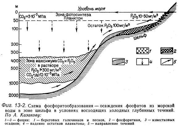Современное соленакопление известно в замкнутых бассейнах аридной зоны разных континентов. Яркими примерами служат залив Кара-Богаз-Гол в восточном Прикаспии и Мёртвое море, заполненное рапой. Месторождения фосфоритов − скоплений скрытокристаллического или микрокристаллического апатита (Ca5[PO4]3F или Ca5[PO4]3Cl, с содержанием P2O5 42,3%) имеют биогенное осадочное и биохимическое осадочное происхождение. Они образуются в прибрежно-мелководных условиях на окраинах континентов. Важными условиями фосфоритообразования являются 2 фактора: богатство органическим веществом и наличие восходящих течений (апвеллинг), выносящих из глубин соединения фосфора (фиг. 13-2). Такие условия соблюдаются в некоторых шельфовых зонах. Другим важным фактором служит расчлененность дна водоёма, т.к. образовавшиеся на возвышенностях дна фосфориты размываются и накапливаются в «ловушках» − понижениях дна.