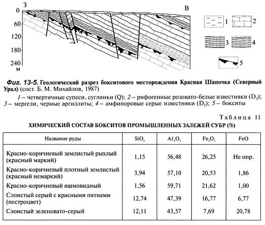 ногенных толщах. Меловые (апт-сеноман) месторождения развиты также в восточных зонах Урала. Месторождения образовались в Зауральском пенеплене и представлены рудами кор выветривания и переотложенных кор выветривания. Наиболее известное крупное месторождение СУБРа — Красная шапочка. Бокситовые залежи расположены в среднедевонской толще известняков, мергелей и углистых аргиллитов. Характерно положение бокситов, типичное и для других месторождений СУБРа: в области перерыва в осадконакоплении. На Красной Шапочке — перерыва в основании эйфеля. Ниже перерыва поверхность известняков закарстована, в известняках развиты впадины глубиной 3-4 м, размером 5-15 м. В связи с этим нижняя поверхность рудного пласта неровная (фиг. 13-5). Кастовые впадины внизу заполнены брекчифми, выше − высококачественные плотные землистые красно-коричневые бокситы и их яшмовидные разности (см. таблицу на фиг. 13-5). Богославское месторождение, представляющее триасовый возрастной уровень бокситонаопления, залегают в буроугольной депрессии, что характерно для месторождений молодой платформы (фиг. 13-6). Мезозойская Таналыкская депрессия большей частью расположена на