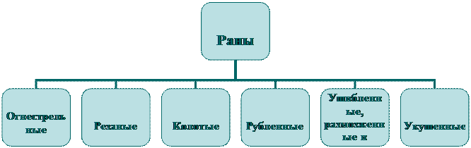 Огнестрельные раны возникают в результате пулевого или осколочного ранения и могут быть сквозными, когда имеются входное и выходное раневые отверстия, слепыми, когда пуля или осколок застревают в тканях, и касательными, при которых пуля или осколок, пролетая по касательной, повреждает кожу и мягкие ткани, не застревая в них. В мирное время часто встречаются дробовые ранения являющиеся результатом случайного выстрела на охоте, неосторожного обращения с оружием, реже вследствие преступных действий. При дробовом ранении, нанесенном с близкого расстояния, образуется большая рваная рана, края которой имбибированы порохом и дробью. Резаные раны – результат воздействия острого режущего орудия (нож, стекло, металлическая стружка). Они имеют ровные края и малую зону поражения, но сильно кровоточат. Колотые раны наносят колющим оружием (штык, шило, игла и др.). При небольшой зоне повреждения кожи или слизистой они могут быть значительной глубины и представляют большую опасность в связи с возможностью поражения внутренних органов и заноса в них инфекции. При проникающих ранениях груди возможно повреждение внутренних органов грудной клетки, что приводит к нарушению сердечной деятельности, кровохарканью и кровотечению через ротовую и носовую полости. Проникающие ранения живота могут быть с повреждением и без повреждения внутренних органов: печени, желудка, кишечника, почек и др., с их выпадением или без выпадения из брюшной полости. Особенно опасны для жизни пострадавших одновременные повреждения внутренних органов грудной клетки и брюшной полости. Рубленные раны наносят тяжелым острым предметом (шашка, топор и др.). Они имеют неодинаковую глубину и сопровождаются ушибом и размозжением мягких тканей. Ушибленные, размозженные и рваные раны являются следствием воздействия тупого предмета. Они характеризуются неровными краями и пропитаны кровью и омертвленными тканями на значительном протяжении. В них часто создаются благоприятные условия для развития инфекции. Укушенные раны наносят чаще всего собаки, редко дикие животные. Раны неправильной формы, загрязнены слюной животных. Течение этих ран осложняется развитием острой инфекции. Особенно опасны раны после укусов бешенных животных. Раны могут быть поверхностными или глубокими, которые, в свою очередь, могут быть непроникающими и проникающими в полость черепа, грудной клетки, брюшную полость. Проникающие ранения особенно опасны. При проникающих ранениях груди возможно повреждение внутренних органов грудной клетки, что является причиной кровоизлияний. При кровоизлиянии в ткани кровь пропитывает их, образуя припухлость, называемую кровоподтеком. Если кровь пропитывает ткани неравномерно, то вследствие раздвигания их образуется ограниченная полость, наполненная кровью, называемая гематомой. Проникающие ранения живота, как уже отмечалось, могут быть с повреждением и без повреждения внутренних органов, с их выпадением или без выпадения из брюшной полости. Признаками проникающих ранений живота, кроме раны, является наличие в нем разлитых болей, напряжение мышц брюшной стенки, вздутие живота, жажда, сухость во рту. Повреждение внутренних органов брюшной полости может быть и при отсутствии раны, в случае закрытых травм живота. Все раны считаются первично зараженными. Мик