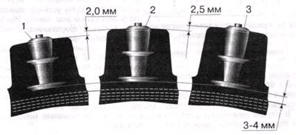 Рисунок 4. Установка шипов различной длины на протектор шины: 1 - шип длиной 11,0 мм: 2 - шип длиной 13,0 мм; 3 - шип длиной 15,5 мм Длина применяемых шипов зависит от толщины протектора шины. Причем можно ставить шипы и на частично изношенные шины. Количество монтируемых шипов зависит от рисунка протектора и размера шины, а их расположение по периметру протектора должно быть равномерным для сохранения предыдущей балансировки колеса. Например, для обычной эксплуатации шины размером 175/70Р13 достаточно 100-120 шипов, расположенных по краям проектора в 3 ряда с каждой стороны.