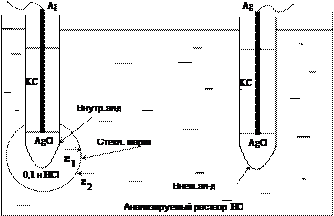 • Применение стеклянного электрода основано на том, • что стекло содержит катионы, которые могут обмениваться с катионами, находящимися в растворе: • Na+(стекло) + Н+ (р-р) = Н+ (ст.) +Na+ (р-р) • По обе стороны стеклянной мембраны возникают потенциалы Е1 и Е2, зависящие от активности обоих растворов HCl. • Ag/ AgCl/ KClнасыщ/ Н+ внутри/Н+ снаружи •