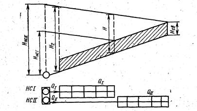 Рис. 10.9. Схема последовательного зонного водоснабжении Зонирование может быть осуществлено по последовательной (рис. 10.9) или по параллельной схеме (рис. 10.10). При последовательном зонировании Насосная станция каждой зоны подает воду в количестве, необходимом для всех вышележащих зон, но под напором, требуемым только для, данной зоны.Насосы верхней зоны могут брать воду или непосредственно из сети нижней зоны (рис. 10.9, а), или из промежуточного резервуара (рис. 10.9,6), Резервуар может служить одновременно источником Питания насосов верхней зоны и контррезервуаром для нижней зоны. Обычно этот резервуар располагается выше границы зон на отметках, Обеспечивающих необходимые напоры в верхних точках сети нижней зоны.