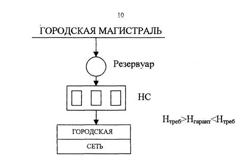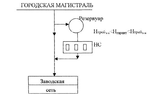 Схема при подаче воды от городской сети, если превышает свободный напор в городской сети, а расход достаточен. Если в городской сети гарантируемый напор больше требуемого свободного напора для хозяйственных нужд предприятия, но меньше, чем для пожаротушения, водопровод устраивают по следующей схеме: