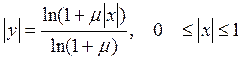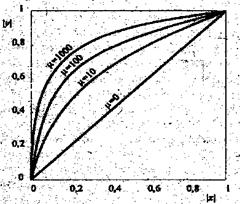 -равномерное квантование с n =12, f0 =8 кГц; -цифровая компрессия до n =8 (компандирование) с помощью нелинейного безинерционного преобразователя y=fкомп (x), где x -значение цифрового сигнала на входе компандера. Характеристика сжатия компандера по μ -закону имеет вид
