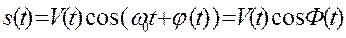 S0 - амплитуда, w0 - круговая частота, j0 - начальная фаза, Ф0(t) - полная фаза колебания. При передаче сообщения модулируется один из параметров несущего колебания (амплитуда, фаза, частота) первичным НЧ сигналом. а) В общем случае вещественный ВЧ модулированный сигнал можно записать выражением в полярной форме