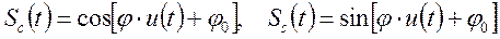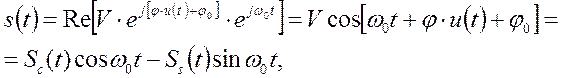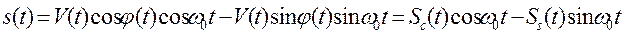 Отметим, что вещественная огибающая V(t) содержит информацию только о модулированной амплитуде. Следовательно, V(t) и j(t) - медленно изменяющиеся функции. НЧ спектр функций Sc(t) и Ss(t) относительно узкий, а умножение на exp(jω0t) в (2.46) согласно теореме о смещении спектра (2.33-3) соответствует смещению спектра НЧ ЦС на частоту ω0. При этом, вся информация о сообщении содержится в НЧ спектре модулированной комплексной огибающей. б) Модулированный ВЧ сигнал (2.45) в квадратурной форме представления имеет вид: