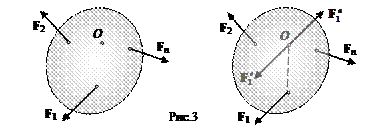 Попытаемся преобразовать плоскую систему { F1, …, Fn }к более простому виду. Для этого выполним перенос каждой из сил F1, …, Fn в произвольную точку О тела, используя прием, показанный на рис.1 для силы F1.