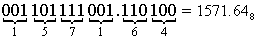 Для перехода от двоичной к восьмеричной (шестнадцатеричной) системе поступают следующим образом: двигаясь от точки влево и вправо, разбивают двоичное число на группы по три (четыре) разряда, дополняя при необходимости нулями крайние левую и правую группы. Затем триаду (тетраду) заменяют соответствующей восьмеричной (шестнадцатеричной) цифрой. Пример. а) Перевести 1101111001.11012