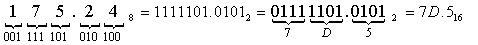 Перевод из восьмеричной в шестнадцатеричную систему и обратно осуществляется через двоичную систему с помощью триад и тетрад. Пример. Перевести 175.248