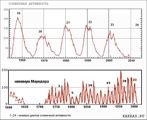 Солнечная активность - циклична. Её перидичность - в среднем, 11 лет. С 1761 года циклам присваиваются номера. Очередной – 24-й по счёту. Череда мощных вспышек на Солнце в первые месяцы 2011 года сопровождалась не только геомагнитными бурями и разрушительными японскими землетрясениями, но и многочисленными "февральскими" революциями в разных странах.