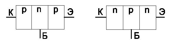 Структура транзистора имеет три области с тремя чередующимися типами проводимости. В зависимости от порядка чередования областей различают транзисторы p-n-p- и n-p-n типа. Они имеют два p-n перехода. Существуют еще полевые транзисторы, имеющие другие структуры. Транзистор является управляемым прибором. Управляющим выводом является база Б, который делается от среднего слоя. Другие два вывода называются эмиттер Э и коллектор К. Управляющей цепью является переход база-эмиттер Б-Э. Этот переход является диодным и ток через него может протекать только по направлению проводимости диодного перехода. Цепь коллектор-эмиттер К-Э является управляемой цепью. С помощью тока через переход Б-Э можно управлять током через переход К-Э.