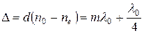 Лучи, поляризованные во взаимно перпендикулярных направлениях, интерференционной картины дать не могут (например, е и о). Однако их можно свести в одну плоскость, пропустив через поляризатор, установленный так, чтобы его плоскость не совпадала с плоскостью колебаний ни одного из лучей. Тогда амплитуды колебаний, прошедших поляризатор, будут равны проекциям амплитуд лучей на плоскость поляризатора. Если свет направить перпендикулярно пластинке, вырезанной параллельно оптической оси кристалла, то лучи о и е, не разделяясь, будут двигаться с разной скоростью. За время прохождения пластинки толщиной d они приобретают разность фаз