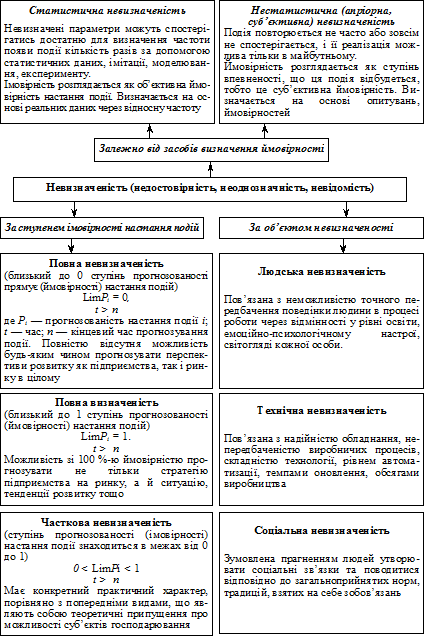 Економіка ринкового типу передбачає існування найрізноманітніших видів невизначеності для всіх суб’єктів господарювання (рис. 6.2). 1. Залежно від засобів визначення ймовірності розрізняють два типи невизначеності - статистичну та нестатистичну. Якщо мається на увазі статистична невизначеність, то іноді кажуть, що рішення приймається в умовах ризику, якщо нестатистична - то рішення приймається в умовах невизначеності. 2. Найпоширенішою є класифікація невизначеності за ступенем настання події тут розрізняють: o повну невизначеність, o повну визначеність, o часткову визначеність. 3. За об’єктом невизначеності класифікують: o людська невизначеність, o технічна невизначеність, o соціальна невизначеність.