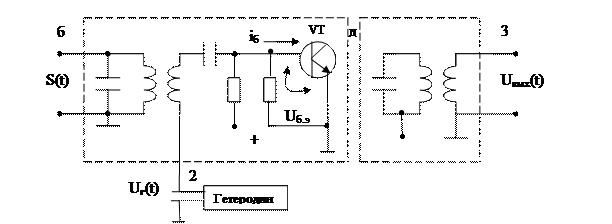 В преобразователе напряжение Uб.э пропорционально сумме напряжений сигнала S(t) и гетеродина Uг(t), т. е. переменная составляющая этого напряжения: Uб.э (t) = S(t) + Uг(t)